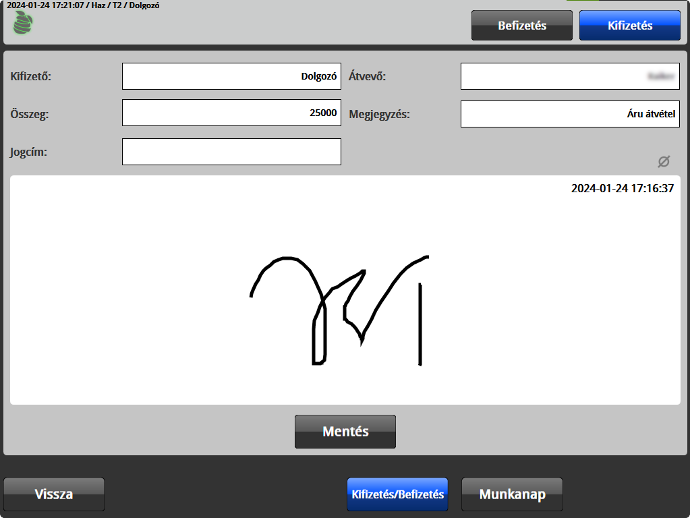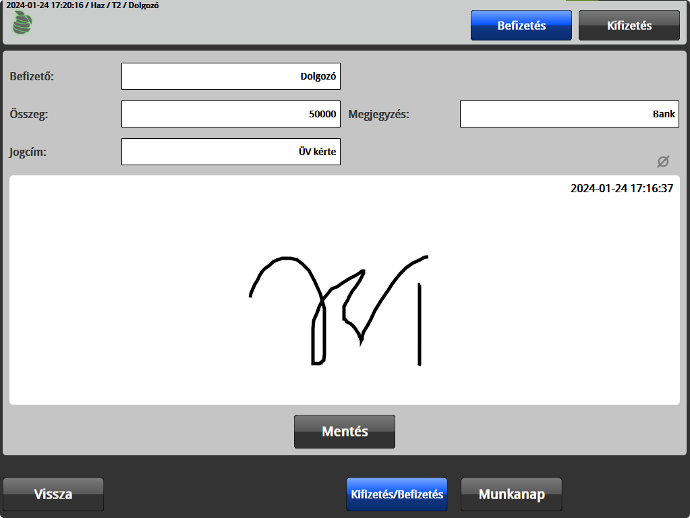 A rendszerben lehetőség van rögzíteni befizetést, illetve kifizetést. Pénztárgép vagy adóügyi nyomtató összeköttetés esetén az adóügyi eszköz bizonylatot nyomtat a műveletről, amit meg kell őrizni.